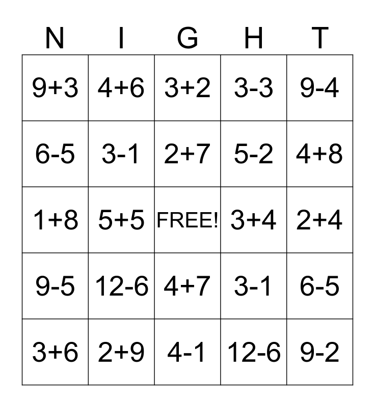 This bingo card has a free space and 24 words: 12-6, 2+9, 2+7, 3+6, 9-4, 9+3, 6-5, 4+6, 3+4, 4+7, 5-2, 1+8, 3-1, 6-5, 3-1, 12-6, 2+4, 3+2, 4+8, 5+5, 9-2, 9-5, 3-3 and 4-1.