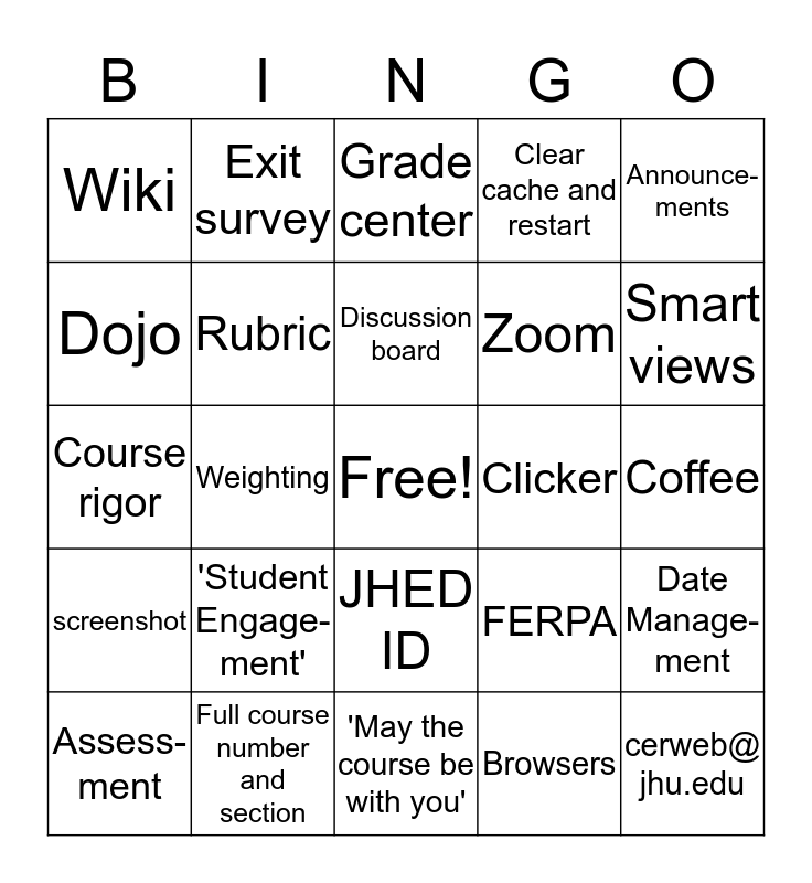 This bingo card has a free space and 25 words: 'Student Engage-ment', 'May the course be with you', Discussion board, Assess-ment, Announce-ments, Wiki, Dojo, Exit survey, Clicker, JHED ID, Zoom, Course rigor, FERPA, Date Manage-ment, Rubric, Bulk download, Coffee, Grade center, Smart views, Weighting, cerweb@ jhu.edu, Full course number and section, screenshot, Clear cache and restart and Browsers.
