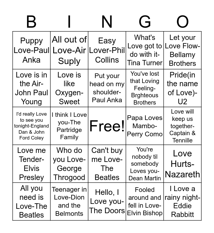 This bingo card has a free space and 26 words: Can't buy me Love-The Beatles, Fooled around and fell in Love-Elvin Bishop, Put your head on my shoulder-Paul Anka, Teenager in Love-Dion and the Belmonts, Let your Love Flow-Bellamy Brothers, Puppy Love-Paul Anka, Love is in the Air-John Paul Young, All out of Love-Air Suply, Love will keep us together-Captain & Tennille, You're nobody til somebody Loves you-Dean Martin, You've lost that Loving Feeling-Brghteous Brothers, I'd really Love to see you tonight-England Dan & John Ford Coley, Love Hurts-Nazareth, All you need is Love-The Beatles, I think I Love you-The Partridge Family, Silly Love Songs-Wings, What's Love got to do with it-Tina Turner, Love me Tender-Elvis Presley, Easy Lover-Phil Collins, I Love a rainy night-Eddie Rabbitt, Pride(in the name of Love)-U2, Hello, I Love you-The Doors, Papa Loves Mambo-Perry Como, Who do you Love-George Throgood, Love is like Oxygen-Sweet and Penny Lover-Lionel Richie.
