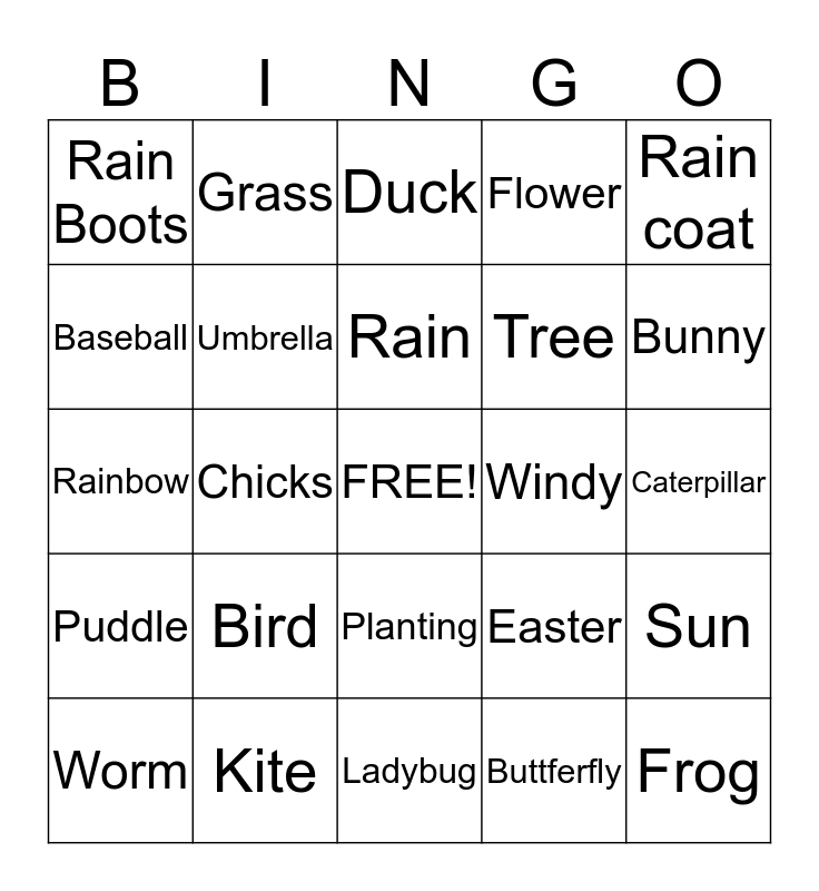 This bingo card has a free space and 24 words: Bird, Kite, Rain, Worm, Rain coat, Rain Boots, Baseball, Grass, Windy, Planting, Tree, Rainbow, Easter, Sun, Umbrella, Buttferfly, Caterpillar, Duck, Bunny, Chicks, Frog, Puddle, Flower and Ladybug.