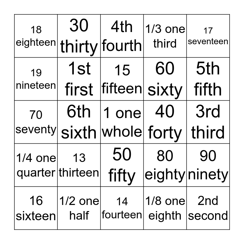 This bingo card has 25 words: 13 thirteen, 14 fourteen, 15 fifteen, 16 sixteen, 17 seventeen, 18 eighteen, 19 nineteen, 30 thirty, 40 forty, 50 fifty, 60 sixty, 70 seventy, 80 eighty, 90 ninety, 1st first, 2nd second, 3rd third, 4th fourth, 5th fifth, 6th sixth, 1 one whole, 1/2 one half, 1/4 one quarter, 1/3 one third and 1/8 one eighth.