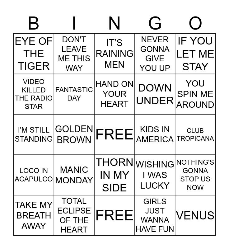This bingo card has 50 words: 99 RED BALLOONS, TOTAL ECLIPSE OF THE HEART, BETTE DAVIS EYES, BREAK OUT, CLUB TROPICANA, COME ON EILEEN, DON'T LEAVE ME THIS WAY, DON'T YOU WANT ME, DOWN UNDER, ECHO BEACH, EYE OF THE TIGER, FANTASTIC DAY, FREE, GIRLS JUST WANNA HAVE FUN, GOING UNDERGROUND, GOLD, GOLDEN BROWN, HAND ON YOUR HEART, I SHOULD BE SO LUCKY, IF YOU LET ME STAY, I'M STILL STANDING, PURPLE RAIN, IT’S RAINING MEN, KIDS IN AMERICA, LIVING IN A BOX, LOCO IN ACAPULCO, MANIC MONDAY, MICKEY, NEVER GONNA GIVE YOU UP, NOTHING'S GONNA STOP US NOW, PERFECT, RESPECTABLE, RIDE ON TIME, TIME AFTER TIME, SWEET DREAMS, TAKE MY BREATH AWAY, THE REFLEX, FREE, THE LAND OF MAKE BELIEVE, YOU SPIN ME AROUND, TAKE ON ME, TWO TRIBES, THORN IN MY SIDE, CALL ME, VENUS, VIDEO KILLED THE RADIO STAR, VIENNA, WHEN WILL I BE FAMOUS, WISHING I WAS LUCKY and THE ONLY WAY IS UP.