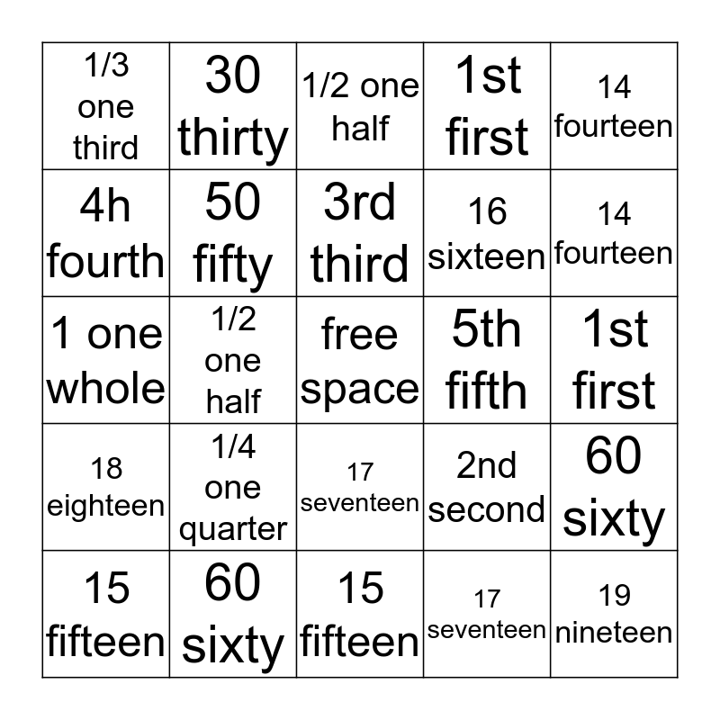 This bingo card has a free space and 49 words: 13 thirteen, 19 nineteen, 1 one whole, 15 fifteen, 1/4 one quarter, 18 eighteen, 30 thirty, 90 ninety, 4h fourth, 80 eighty, 50 fifty, 1st first, 60 sixty, 2nd second, 6th sixth, 40 forty, 3rd third, 5th fifth, 70 seventy, 14 fourteen, 1/2 one half, 17 seventeen, 1/3 one third, 16 sixteen, 13 thirteen, 14 fourteen, 15 fifteen, 16 sixteen, 17 seventeen, 18 eighteen, 19 nineteen, 30 thirty, 40 forty, 50 fifty, 60 sixty, 70 seventy, 80 eighty, 90 ninety, 1st first, 2nd second, 3rd third, 4th fourth, 5th fifth, 6th sixth, 1 one whole, 1/2 one half, 1/4 one quarter, 1/3 one third and 1/8 one eighth.