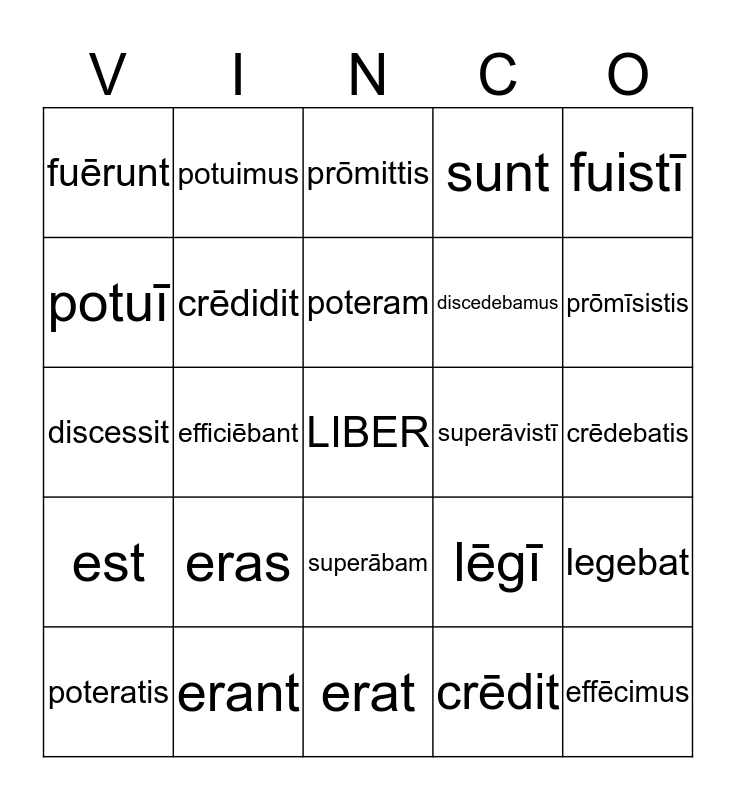 This bingo card has a free space and 24 words: eras, erant, poteram, poteratis, fuistī, fuērunt, potuī, potuimus, superāvistī, superābam, discedebamus, discessit, lēgī, legebat, crēdidit, crēdit, crēdebatis, prōmittis, prōmīsistis, efficiēbant, effēcimus, est, sunt and erat.