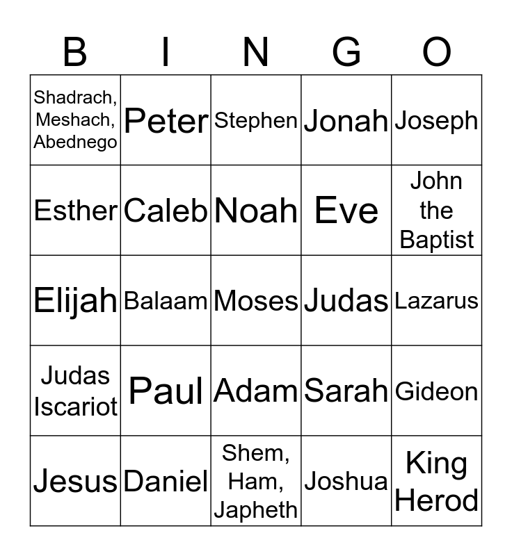 This bingo card has a free space and 24 words: Paul, Daniel, Noah, Jesus, Joseph, Shadrach, Meshach, Abednego, Esther, Peter, Judas, Adam, Eve, Elijah, Sarah, Gideon, Caleb, Joshua, Lazarus, Stephen, John the Baptist, Balaam, King Herod, Judas Iscariot, Jonah and Shem, Ham, Japheth.