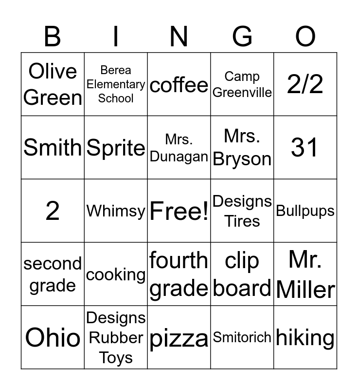 This bingo card has a free space and 29 words: Ohio, Michigan, Whimsy, Lindsey, Olive Green, coffee, Sprite, cooking, Designs Tires, Designs Rubber Toys, Bullpups, hiking, pizza, Smitorich, 31, 22, fourth grade, second grade, 2/2, 2, clip board, 2 laps, Mrs. Bryson, Smith, Camp Greenville, Berea Elementary School, Mr. Miller, Mrs. Dunagan and 2:25.