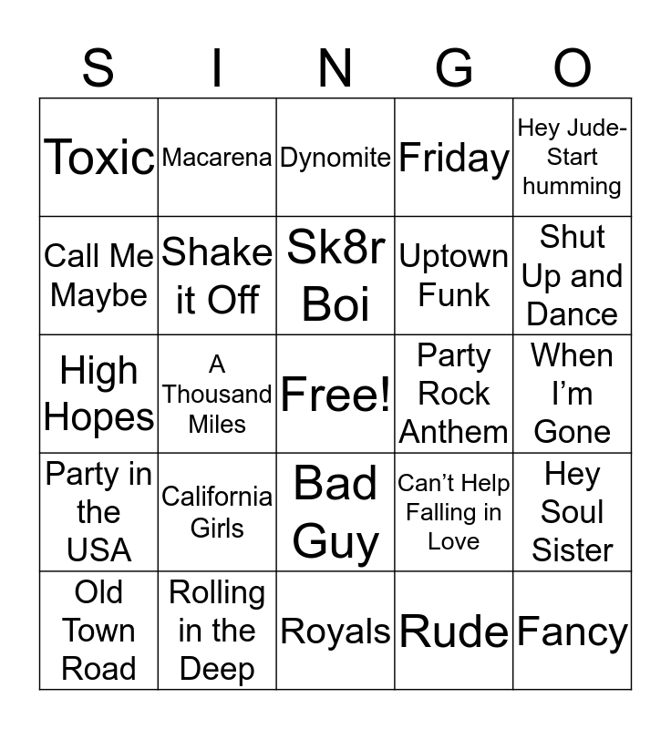 This bingo card has a free space and 29 words: Old Town Road, Meet Me in the Middle, A Thousand Miles, All Star, Toxic, Dynomite, Shake it Off, California Girls, Party Rock Anthem, Rolling in the Deep, When I’m Gone, Fancy, Royals, Rude, Shut Up and Dance, Havana, Bad Guy, Party in the USA, Hey Jude- Start humming, High Hopes, Can’t Help Falling in Love, I Gotta Feelin, Uptown Funk, Call Me Maybe, Friday, Macarena, Hey Soul Sister, Sk8r Boi and Radioactive.