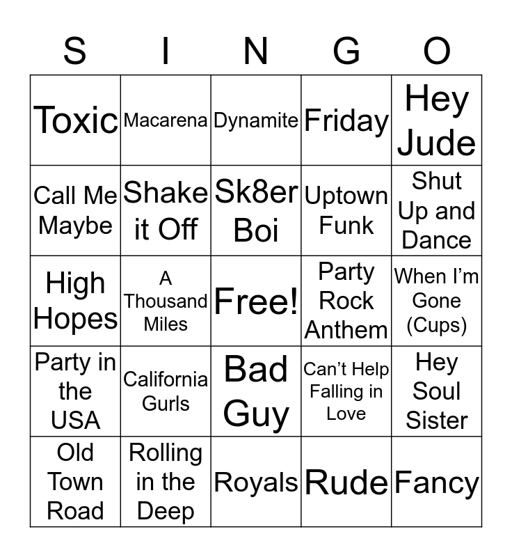 This bingo card has a free space and 29 words: Old Town Road, Meet Me in the Middle, A Thousand Miles, All Star, Toxic, Dynamite, Shake it Off, California Gurls, Party Rock Anthem, Rolling in the Deep, When I’m Gone (Cups), Fancy, Royals, Rude, Shut Up and Dance, Havana, Bad Guy, Party in the USA, Hey Jude, High Hopes, Can’t Help Falling in Love, I Gotta Feelin, Uptown Funk, Call Me Maybe, Friday, Macarena, Hey Soul Sister, Sk8er Boi and Radioactive.