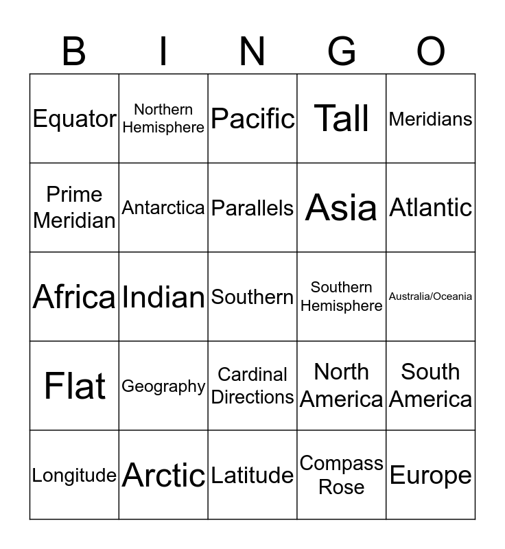 This bingo card has 25 words: Geography, Latitude, Parallels, Longitude, Meridians, Equator, Prime Meridian, Northern Hemisphere, Southern Hemisphere, Cardinal Directions, Asia, Africa, North America, South America, Antarctica, Europe, Australia/Oceania, Pacific, Atlantic, Indian, Southern, Arctic, Flat, Tall and Compass Rose.