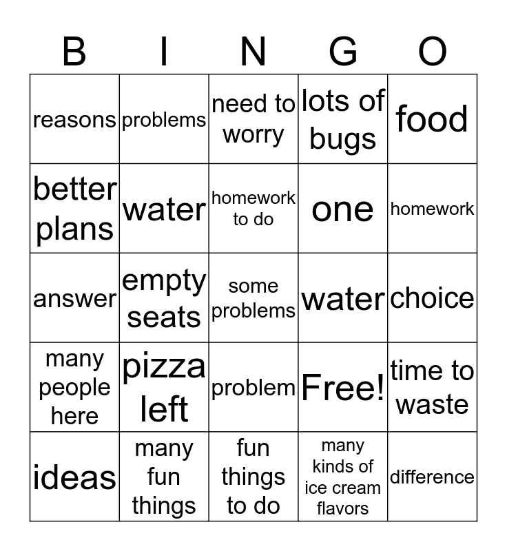 This bingo card has 25 words: pizza left, fun things to do, homework to do, ideas, food, reasons, better plans, problems, water, problem, one, answer, Free!, time to waste, water, difference, choice, need to worry, homework, empty seats, some problems, many fun things, many people here, lots of bugs and many kinds of ice cream flavors.