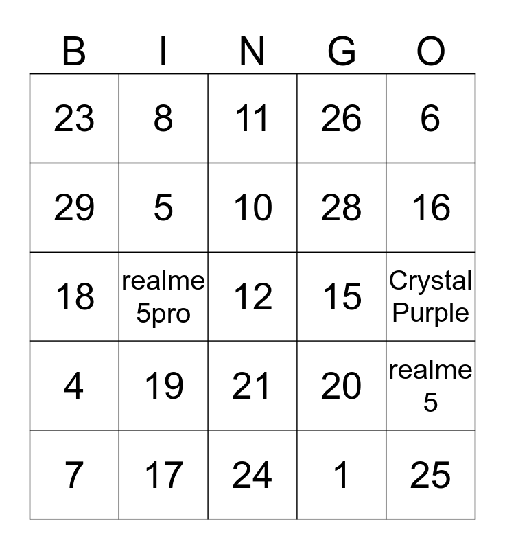 This bingo card has a free space and 34 words: Crystal Blue, 1, 2, 3, 4, 5, 6, 7, 8, 9, 10, 11, 13, 14, 15, 16, 17, 18, 19, 20, 21, 22, 23, Crystal Purple, 24, 25, 26, 27, 28, 29, 30, realme 5pro, realme 5 and realme Buds 2.