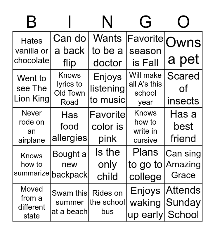 This bingo card has a free space and 24 words: Bought a new backpack, Swam this summer at a beach, Enjoys listening to music, Moved from a different state, Owns a pet, Hates vanilla or chocolate, Went to see The Lion King, Can do a back flip, Knows how to write in cursive, Is the only child, Will make all A's this school year, Never rode on an airplane, Plans to go to college, Can sing Amazing Grace, Knows lyrics to Old Town Road, Enjoys waking up early, Has a best friend, Wants to be a doctor, Scared of insects, Has food allergies, Attends Sunday School, Knows how to summarize, Favorite season is Fall and Rides on the school bus.