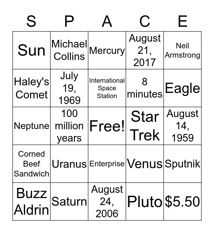 This bingo card has a free space and 34 words: Jupitor, Pluto, Buzz Lightyear, Wright Brothers Plane, Corned Beef Sandwich, July 19, 1969, Neil Armstrong, Buzz Aldrin, Michael Collins, Dirt from Yankee Stadium, International Space Station, Mercury, Mars, Earth, Star Trek, Eagle, Saturn, Neptune, Uranus, Venus, Enterprise, TESS, Sun, August 14, 1959, August 24, 2006, $5.50, August 21, 2017, Lunar Eclipse, 8 minutes, Haley's Comet, $12 million, 100 million years, Sputnik and John Glenn.