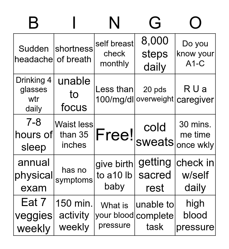 This bingo card has a free space and 24 words: has no symptoms, 150 min. activity weekly, Less than 100/mg/dl, Eat 7 veggies weekly, Do you know your A1-C, Sudden headache, Drinking 4 glasses wtr daily, shortness of breath, cold sweats, give birth to a10 lb baby, 20 pds overweight, 7-8 hours of sleep, getting sacred rest, check in w/self daily, unable to focus, unable to complete task, 30 mins. me time once wkly, self breast check monthly, R U a caregiver, Waist less than 35 inches, high blood pressure, annual physical exam, 8,000 steps daily and What is your blood pressure.
