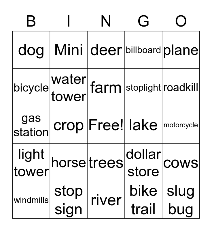 This bingo card has a free space and 24 words: horse, stop sign, farm, windmills, plane, dog, bicycle, Mini, lake, trees, stoplight, gas station, dollar store, cows, water tower, bike trail, motorcycle, deer, roadkill, crop, slug bug, light tower, billboard and river.