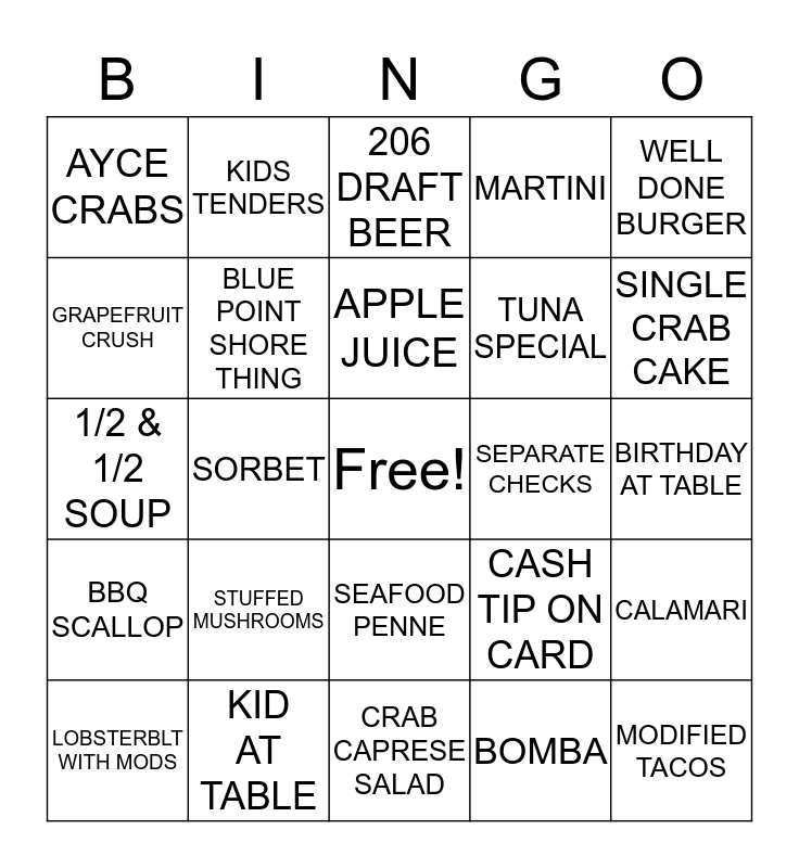 This bingo card has a free space and 29 words: LOBSTERBLT WITH MODS, CRAB QUAC, SORBET, ADULT SORBET, AYCE CRABS, 206 DRAFT BEER, BLUE POINT SHORE THING, STUFFED MUSHROOMS, SEPARATE CHECKS, KID AT TABLE, BIRTHDAY AT TABLE, MODIFIED TACOS, CRAB CAPRESE SALAD, BOMBA, SINGLE CRAB CAKE, SEAFOOD BOIL, SEAFOOD PENNE, BBQ SCALLOP, WELL DONE BURGER, 1/2 & 1/2 SOUP, CASH TIP ON CARD, SOFT SHELL BLT, TUNA SPECIAL, GRAPEFRUIT CRUSH, MARTINI, KIDS TENDERS, CALAMARI, APPLE JUICE and AS YOU WISH.