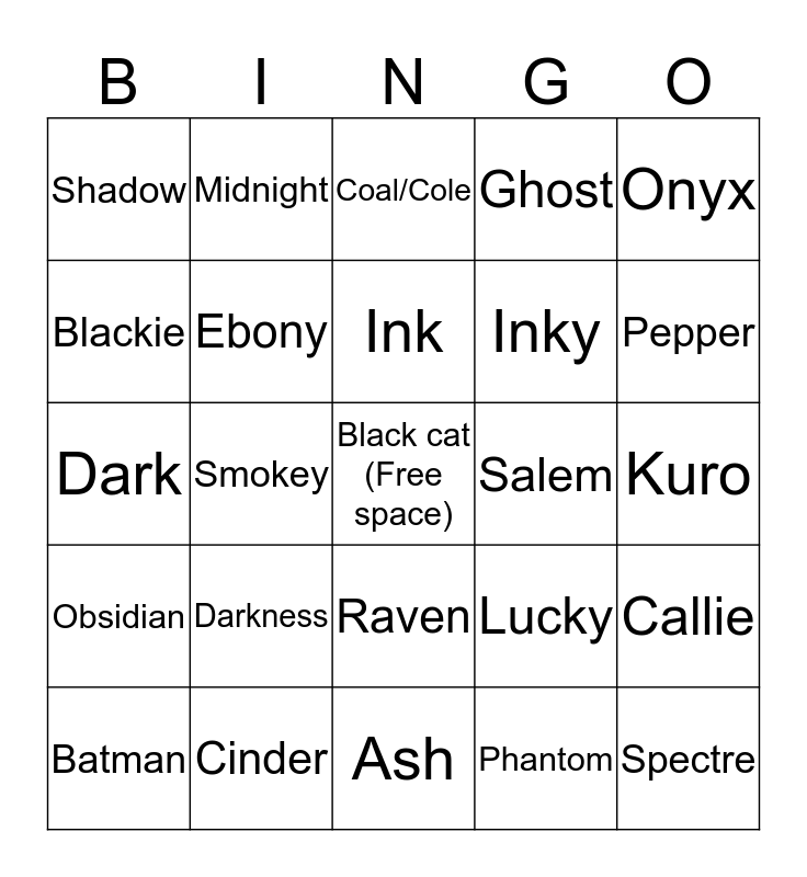 This bingo card has a free space and 24 words: Darkness, Cinder, Ink, Batman, Onyx, Shadow, Blackie, Midnight, Salem, Raven, Inky, Dark, Lucky, Callie, Ebony, Phantom, Kuro, Coal/Cole, Pepper, Smokey, Spectre, Obsidian, Ghost and Ash.
