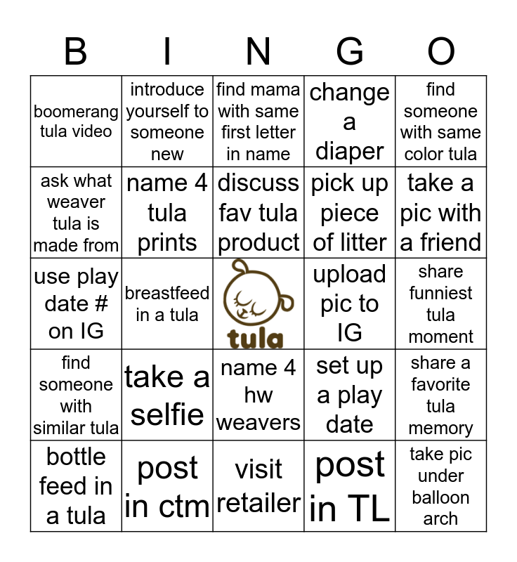 This bingo card has a free space and 24 words: take a selfie, post in ctm, discuss fav tula product, bottle feed in a tula, find someone with same color tula, boomerang tula video, ask what weaver tula is made from, introduce yourself to someone new, upload pic to IG, name 4 hw weavers, pick up piece of litter, use play date # on IG, set up a play date, share a favorite tula memory, name 4 tula prints, post in TL, share funniest tula moment, find mama with same first letter in name, take a pic with a friend, breastfeed in a tula, take pic under balloon arch, find someone with similar tula, change a diaper and visit retailer.