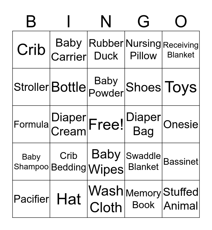 This bingo card has a free space and 46 words: Bathtub, Stuffed Animal, Socks, Wash Cloth, Crib Bedding, High Chair, Baby Carrier, Changing Pad, Stroller, Booties, Bottle, Nursing Pillow, Bassinet, Swaddle Blanket, Burp Cloth, Baby Monitor, Baby Powder, Diaper Bag, Parenting Book, Receiving Blanket, Diaper Cream, Memory Book, Crib, Shoes, Breast Pump, Toys, Pacifier, Lotion, Baby Wipes, Baby Shampoo, Nail Clippers, Mobile, Teething Ring, car seat, Rattle, Hat, Onesie, Bouncer, Nursery, Storybook, Bibs, Rubber Duck, Formula, Boppy, Baby Swing and Rocking Chair.
