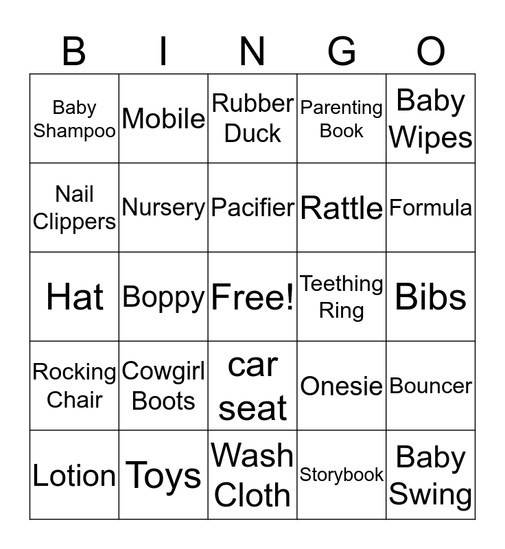 This bingo card has a free space and 24 words: Cowgirl Boots, Toys, Pacifier, Lotion, Baby Wipes, Baby Shampoo, Nail Clippers, Mobile, Teething Ring, car seat, Rattle, Hat, Onesie, Bouncer, Nursery, Storybook, Bibs, Rubber Duck, Formula, Boppy, Baby Swing, Rocking Chair, Parenting Book and Wash Cloth.