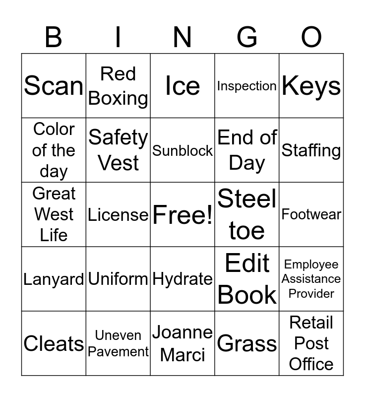 This bingo card has a free space and 39 words: CUPW, LJOHSC, Dogs, Safety Vest, Cleats, Hydrate, Sunblock, Vehicle log, Keys, Lanyard, License, Inspection, Retail Post Office, Footwear, Steel toe, Uniform, PDT, Scan, NM, Edit Book, Color of the day, Joanne Marci, End of Day, Staffing, Slips Trips Falls, Locked Vehicle, Out of Spec, APC, Driving Record, Red Boxing, Look Ahead, Stairs, Ice, Uneven Pavement, Grass, Short Term Disability, Employee Assistance Provider, Great West Life and Contact Information.