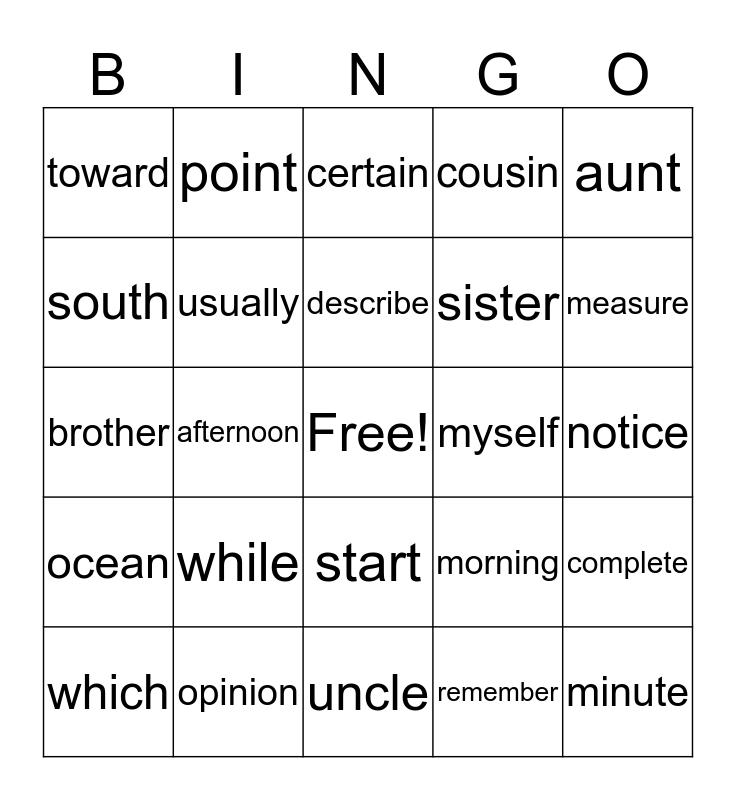 This bingo card has a free space and 24 words: while, opinion, describe, which, aunt, toward, south, point, myself, start, sister, brother, morning, complete, usually, remember, notice, certain, measure, afternoon, minute, ocean, cousin and uncle.