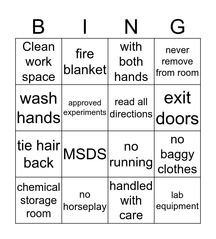 This bingo card has 24 words: fire extinguisher, emergency eye wash, exit doors, tell the teacher, wash hands, Clean work space, approved experiments, fire blanket, no horseplay, no food or drink, tie hair back, no running, closed toe shoes, sharps container, read all directions, no jewelry, handled with care, with both hands, MSDS, no baggy clothes, chemical storage room, lab equipment, never remove from room and gloves.