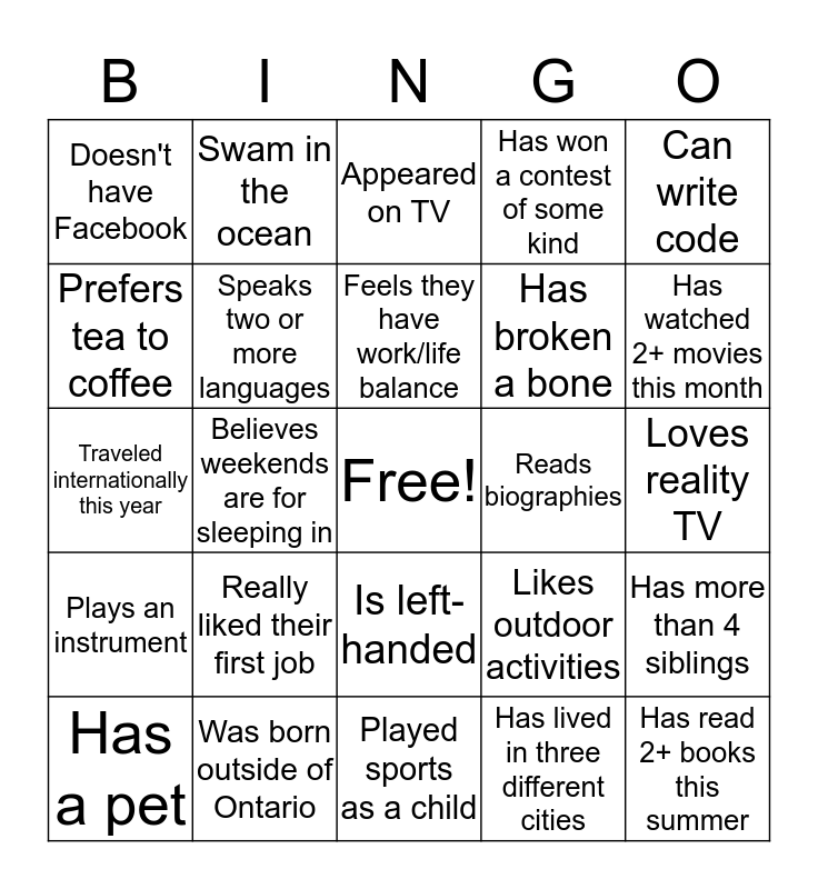 This bingo card has a free space and 24 words: Really liked their first job, Was born outside of Ontario, Feels they have work/life balance, Has a pet, Can write code, Doesn't have Facebook, Prefers tea to coffee, Swam in the ocean, Reads biographies, Is left-handed, Has broken a bone, Traveled internationally this year, Likes outdoor activities, Has more than 4 siblings, Speaks two or more languages, Has lived in three different cities, Loves reality TV, Appeared on TV, Has watched 2+ movies this month, Believes weekends are for sleeping in, Has read 2+ books this summer, Plays an instrument, Has won a contest of some kind and Played sports as a child.