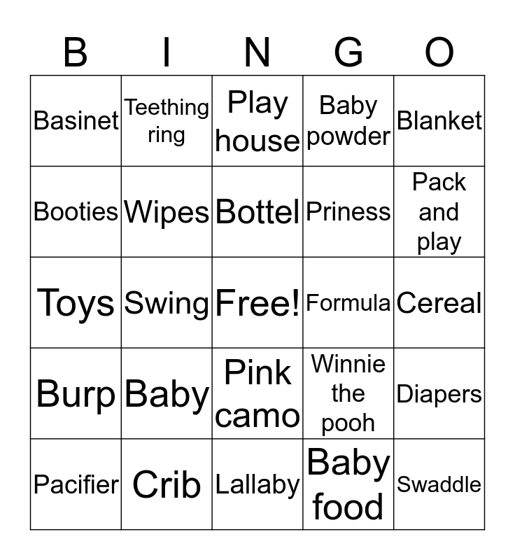 This bingo card has a free space and 24 words: Baby, Crib, Bottel, Pacifier, Blanket, Basinet, Booties, Teething ring, Formula, Pink camo, Priness, Toys, Winnie the pooh, Diapers, Wipes, Baby food, Cereal, Play house, Pack and play, Swing, Swaddle, Burp, Baby powder and Lallaby.