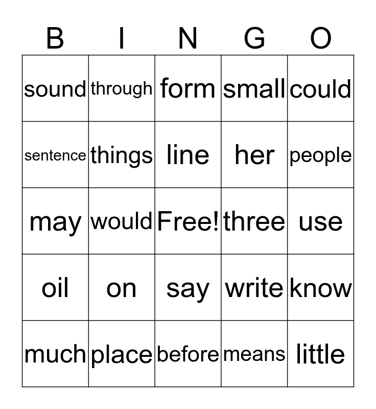 This bingo card has a free space and 24 words: on, place, line, much, could, sound, sentence, through, three, say, her, may, write, know, things, means, use, form, people, would, little, oil, small and before.