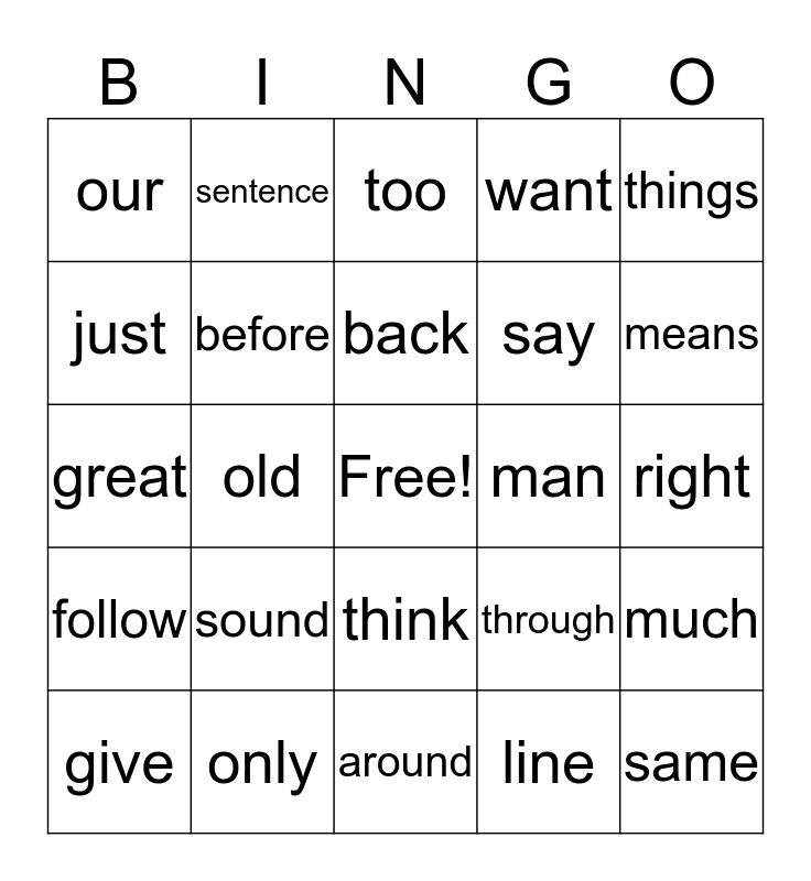 This bingo card has a free space and 24 words: sound, only, back, give, things, our, just, sentence, man, think, say, great, through, much, before, line, right, too, means, old, same, follow, want and around.