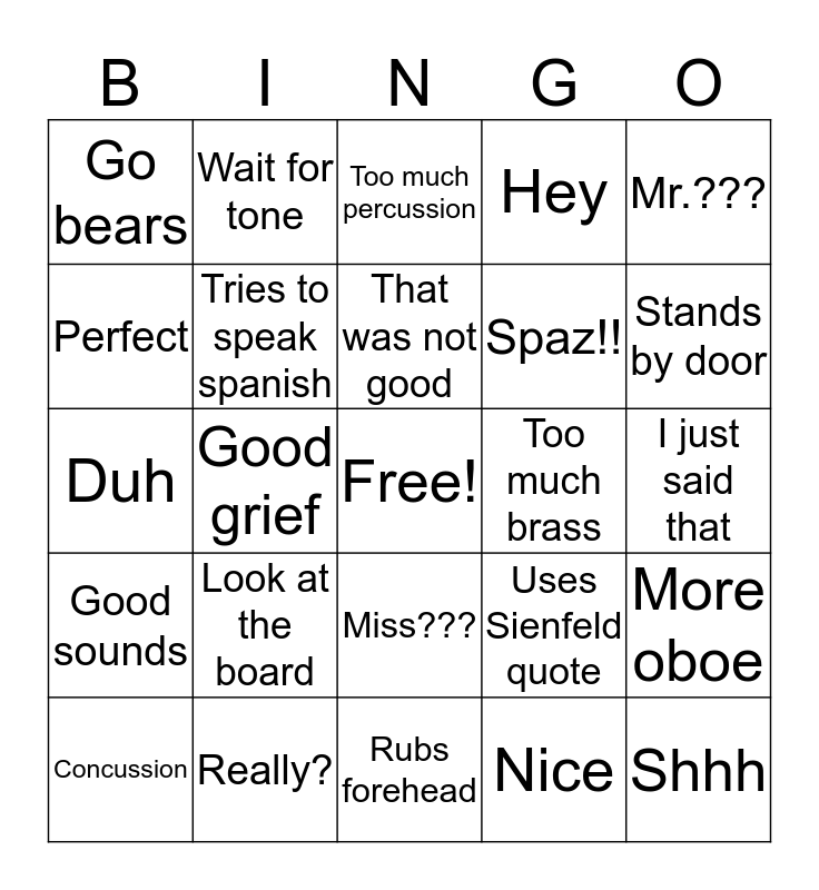 This bingo card has a free space and 44 words: Last time, Shhh, Ladies and gentlemen, Concussion, Key please, Nice, Too much percussion, Good work, Mr.???, Really?, Hey, Too much brass, Miss???, Look at the board, Phone down, Rubs forehead, Make good choices, Duh, Next question, Stands by door, Wait for tone, 5$, Not now, Go bears, Dumb question, I just said that, 2nd valve, It's an F sharp, Uses Sienfeld quote, Good sounds, Less percussion, More oboe, Where is the melody?, Dude, Good grief, Exhales loudly, Use your words..., Please practice, That was not good, Perfect, Spaz!!, First mistake, Tries to speak spanish and True story.