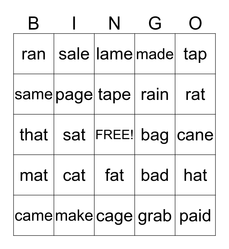 This bingo card has a free space and 24 words: cat, make, tape, came, tap, ran, same, sale, bag, fat, rain, that, bad, hat, page, grab, cane, lame, rat, sat, paid, mat, made and cage.