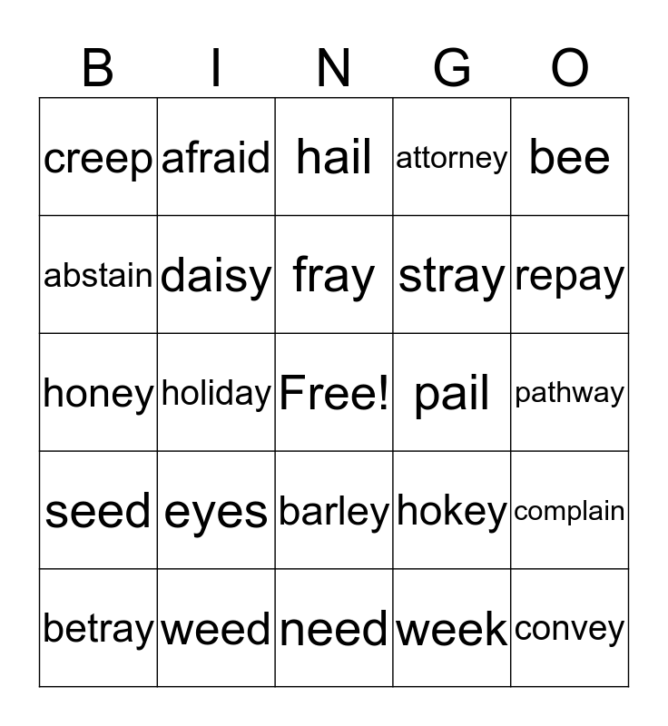 This bingo card has a free space and 25 words: seed, weed, need, week, bee, creep, afraid, hail, pail, complain, abstain, daisy, again, hokey, repay, betray, holiday, fray, stray, pathway, honey, eyes, barley, attorney and convey.