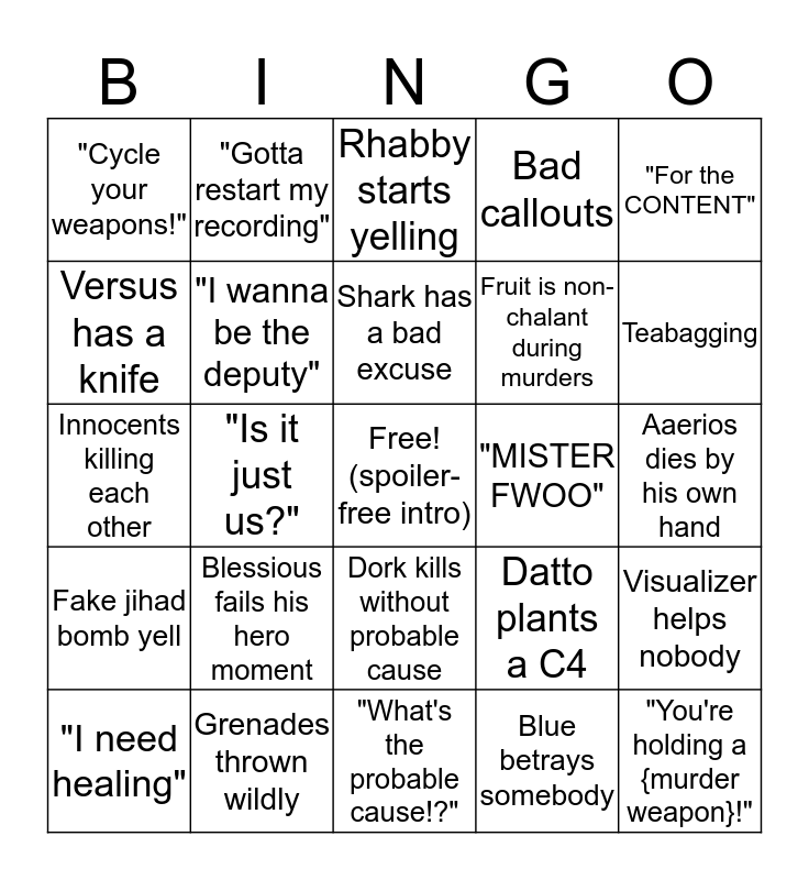 This bingo card has a free space and 24 words: Blessious fails his hero moment, Grenades thrown wildly, Shark has a bad excuse, "I need healing", "For the CONTENT", "Cycle your weapons!", Versus has a knife, "Gotta restart my recording", "MISTER FWOO", Dork kills without probable cause, Fruit is non-chalant during murders, Innocents killing each other, Datto plants a C4, Visualizer helps nobody, "I wanna be the deputy", Blue betrays somebody, Aaerios dies by his own hand, Rhabby starts yelling, Teabagging, "Is it just us?", "You're holding a {murder weapon}!", Fake jihad bomb yell, Bad callouts and "What's the probable cause!?".