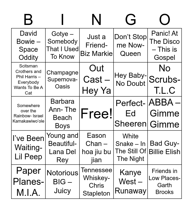 This bingo card has a free space and 26 words: Eason Chan – hoa jiu bu jian, Kanye West – Runaway, Out Cast – Hey Ya, Notorious BIG – Juicy, Panic! At The Disco – This is Gospel, David Bowie – Space Oddity, Scitsman Crothers and Phil Harris – Everybody Wants To Be A Cat, Gotye – Somebody That I Used To Know, ABBA – Gimme Gimme, White Snake – In The Still Of The Night, Hey Baby- No Doubt, Somewhere over the Rainbow- Israel Kamakawiwo’ole, Bad Guy- Billie Elish, Paper Planes- M.I.A., Barbara Ann- The Beach Boys, Hollaback Girl- Gwen Stefani, Don’t Stop me Now- Queen, I’ve Been Waiting- Lil Peep, Just a Friend- Biz Markie, Friends in Low Places- Garth Brooks, No Scrubs- T.L.C, Tennessee Whiskey- Chris Stapleton, Perfect- Ed Sheeren, Young and Beautiful- Lana Del Rey, Champagne Supernova- Oasis and People help the People- Birdy.