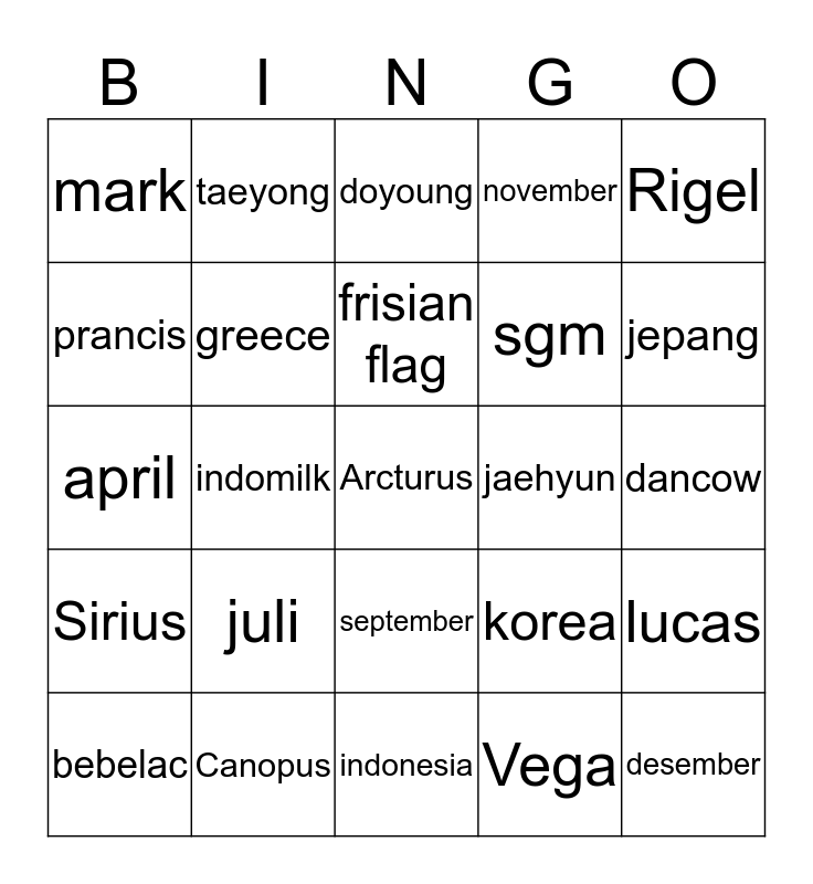 This bingo card has 25 words: Sirius, Canopus, Arcturus, Vega, Rigel, mark, taeyong, doyoung, jaehyun, lucas, prancis, greece, indonesia, korea, jepang, bebelac, indomilk, frisian flag, sgm, dancow, april, juli, september, november and desember.