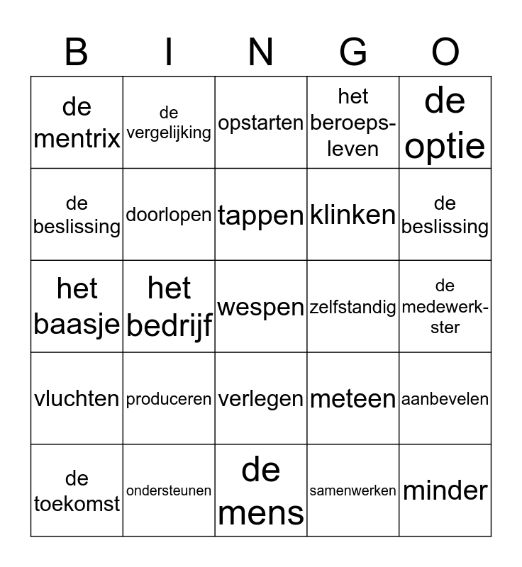 This bingo card has a free space and 29 words: de toekomst, de stageplaats, het bedrijf, het contact, de mentrix, opstarten, doorlopen, produceren, zelfstandig, ondersteunen, de medewerk- ster, minder, de mens, samenwerken, de beslissing, de natuur, verlegen, vluchten, de optie, het baasje, meteen, het baasje, klinken, de beslissing, het beroeps-leven, de vergelijking, aanbevelen, tappen and verversen.