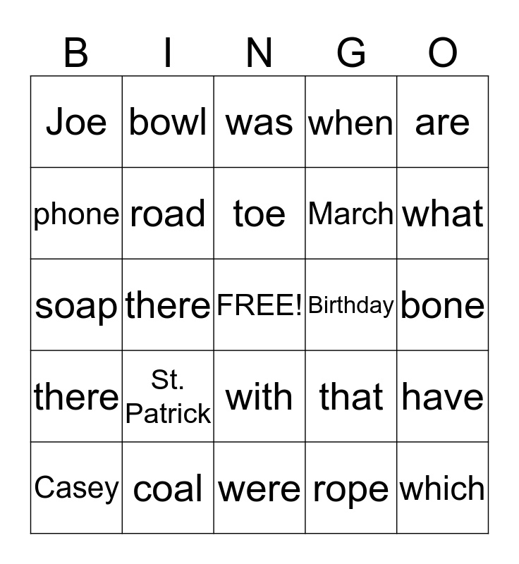This bingo card has a free space and 24 words: St. Patrick, coal, toe, Casey, are, Joe, phone, bowl, Birthday, with, March, soap, that, have, road, rope, bone, was, what, there, which, there, when and were.