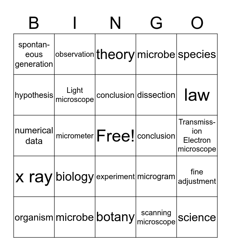 This bingo card has a free space and 24 words: biology, microbe, conclusion, organism, species, spontan- eous generation, hypothesis, observation, conclusion, experiment, dissection, numerical data, microgram, fine adjustment, Light microscope, scanning microscope, Transmiss-ion Electron microscope, theory, law, micrometer, science, x ray, microbe and botany.