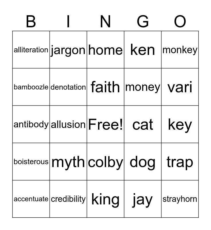This bingo card has a free space and 24 words: accentuate, myth, faith, jay, monkey, alliteration, jargon, home, cat, key, antibody, denotation, dog, trap, bamboozle, credibility, king, ken, vari, boisterous, allusion, colby, money and strayhorn.