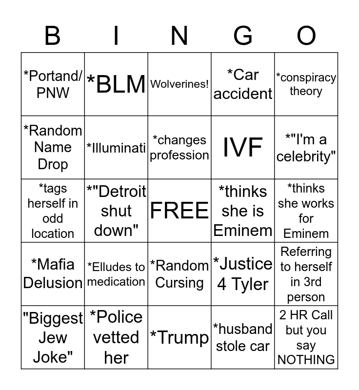 This bingo card has a free space and 24 words: "Biggest Jew Joke", *Elludes to medication, *changes profession, *husband stole car, *conspiracy theory, *Portand/ PNW, *BLM, Wolverines!, *thinks she is Eminem, *thinks she works for Eminem, *tags herself in odd location, *Illuminati, *Justice 4 Tyler, Referring to herself in 3rd person, *Random Name Drop, *Police vetted her, *Trump, *Car accident, *"I'm a celebrity", *Mafia Delusion, *"Detroit shut down", *Random Cursing, IVF and 2 HR Call but you say NOTHING.