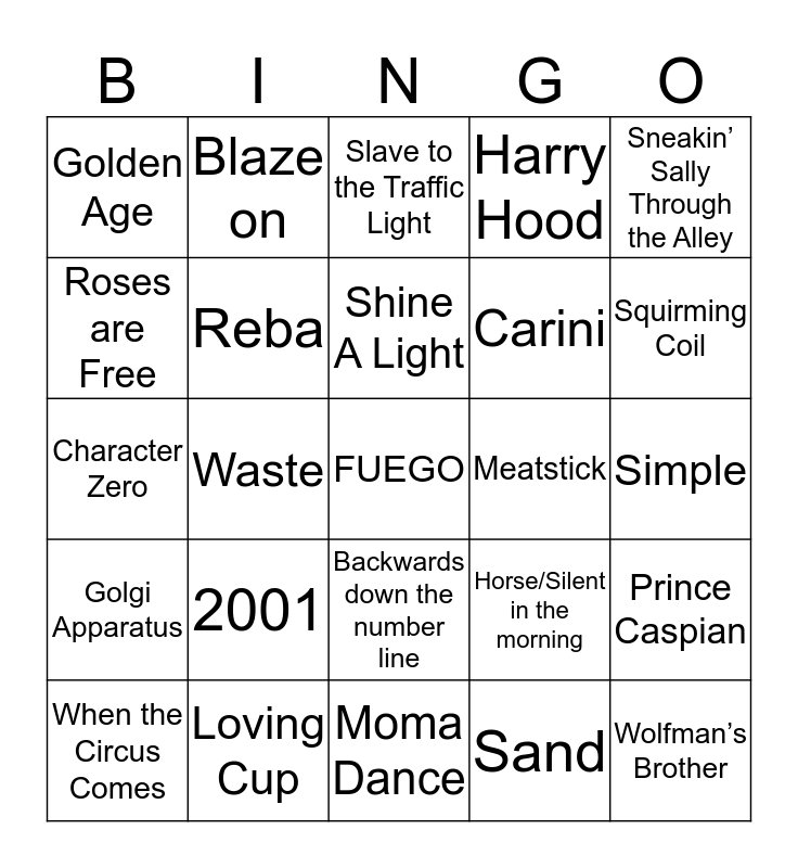 This bingo card has a free space and 24 words: 2001, Loving Cup, Shine A Light, When the Circus Comes, Sneakin’ Sally Through the Alley, Golden Age, Roses are Free, Blaze on, Meatstick, Backwards down the number line, Carini, Character Zero, Horse/Silent in the morning, Prince Caspian, Reba, Sand, Simple, Slave to the Traffic Light, Squirming Coil, Waste, Wolfman’s Brother, Golgi Apparatus, Harry Hood and Moma Dance.