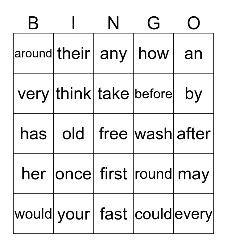 This bingo card has a free space and 24 words: once, your, take, would, an, around, very, their, wash, first, before, has, round, may, think, could, after, any, by, old, every, her, how and fast.