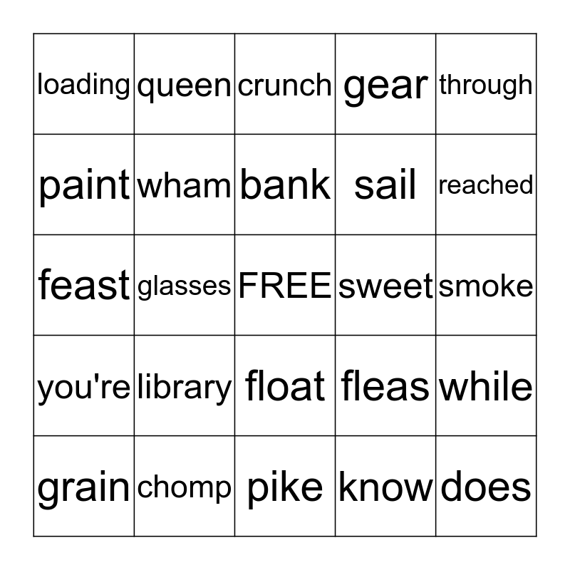 This bingo card has a free space and 24 words: library, chomp, bank, grain, through, loading, paint, queen, sweet, float, sail, feast, fleas, while, wham, know, smoke, crunch, reached, glasses, does, you're, gear and pike.