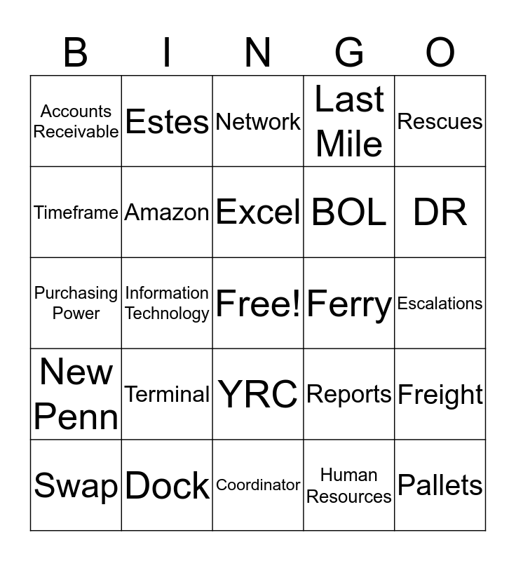 This bingo card has a free space and 100 words: Bed Bath, Product Description, Coordinator, Customer Experience, Quote, VIP, Gap Time, OTP, Disposition, On time Performance, East coast, West coast, Central Region, Ferry, IT, Business Intelligence, Information Technology, Account Manager, Same Day Receiving, Scorecards, Looker Dashboard, Attempt, Refused, Skype, Concealed Damage, Swap, Amazon, YRC, FedEx, Central Transport, New Penn, Estes, Barr Nunn, HDU, Lowes, Purchasing Power, Direct Buy, Bush, Human Resources, Dispatch, Dispatch Track, Outlook, Excel, Reports, Escalations, Timeframe, Basic Plus, Deluxe, AP Log, Pallets, Shrink Wrap, Shipnsd.com, Map, GPS, Territory, Avail-R, Approved, Cisco, Crossdock, Rescues, Delivery, Returns, Claims, ICON, Customer, Line Haul, Storage, Last Mile, Teamwork, Transportation, CSR, Dock, Warehouse, Threshold, OSD, Assembly, NSD, Network, Logistics, Extra Mile, Upgrade, Terminal, Account, Last Mile, Accounts Payable, Accounts Receivable, Delivery Driver, Agent, Carrier, Freight, ETA, Damage, Billing, BOL, DR, POD, Unbundled, Bundled, Proof of Delivery and Estimated Time of Arrival.