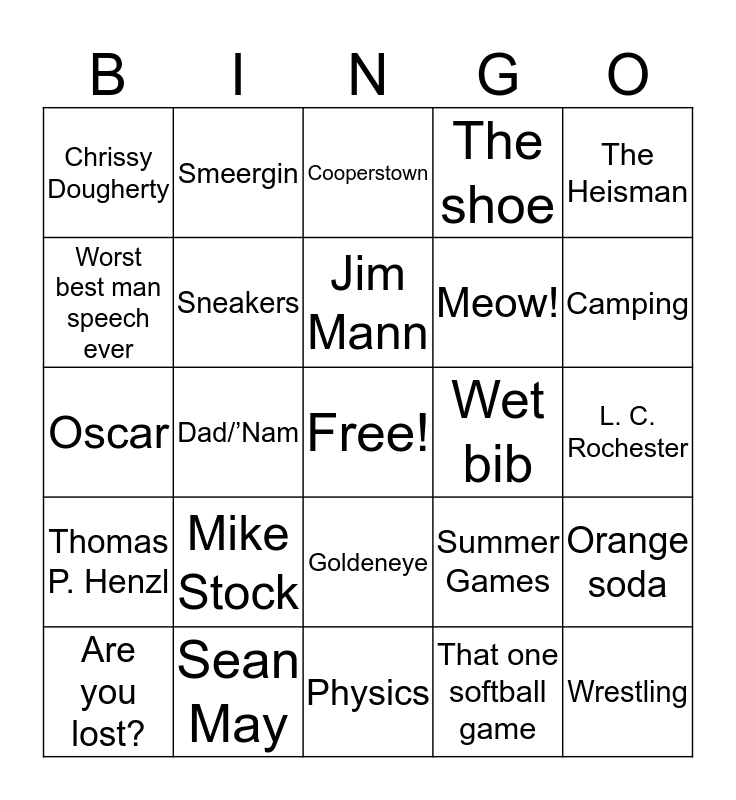 This bingo card has a free space and 24 words: Mike Stock, Sean May, Jim Mann, Are you lost?, The Heisman, Chrissy Dougherty, Worst best man speech ever, Smeergin, Wet bib, Goldeneye, Meow!, Oscar, Summer Games, Orange soda, Sneakers, That one softball game, L. C. Rochester, Cooperstown, Camping, Dad/’Nam, Wrestling, Thomas P. Henzl, The shoe and Physics.
