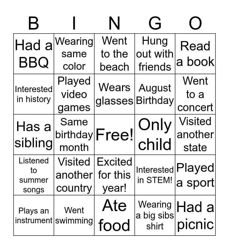 This bingo card has a free space and 24 words: Visited another country, Went swimming, Wears glasses, Plays an instrument, Read a book, Had a BBQ, Interested in history, Wearing same color, Only child, Excited for this year!, August Birthday, Has a sibling, Interested in STEM!, Played a sport, Played video games, Wearing a big sibs shirt, Visited another state, Went to the beach, Went to a concert, Same birthday month, Had a picnic, Listened to summer songs, Hung out with friends and Ate food.