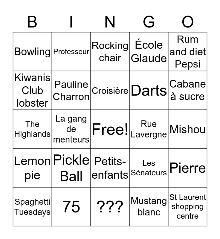 This bingo card has a free space and 24 words: Pickle Ball, 75, Croisière, Spaghetti Tuesdays, Rum and diet Pepsi, Bowling, Kiwanis Club lobster, Professeur, Rue Lavergne, Petits-enfants, Darts, The Highlands, Les Sénateurs, Pierre, Pauline Charron, Mustang blanc, Mishou, Rocking chair, Cabane à sucre, La gang de menteurs, St Laurent shopping centre, Lemon pie, École Glaude and ???.
