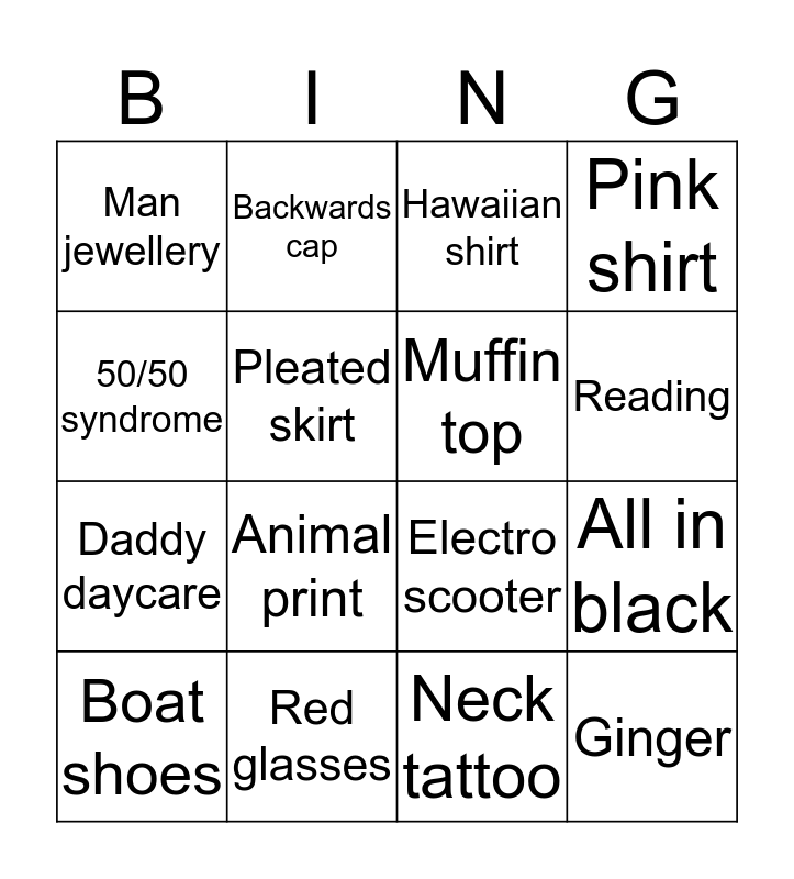 This bingo card has 33 words: Goatee, Instrument, All in black, Red shoes, Ginger, Muffin top, 50/50 syndrome, Eating on the go, Backwards cap, Glitter shiny, Reading, Hawaiian shirt, Crying child, Sunburn, Red glasses, Animal print, Numbers, Electro scooter, Chequered, Moustache, Leggings, Tall granny, Man jewellery, Neck tattoo, Running, Boat shoes, Pink shirt, Daddy daycare, Pleated skirt, Animal T-shirt, Punk, Multi-dog and Man pony.